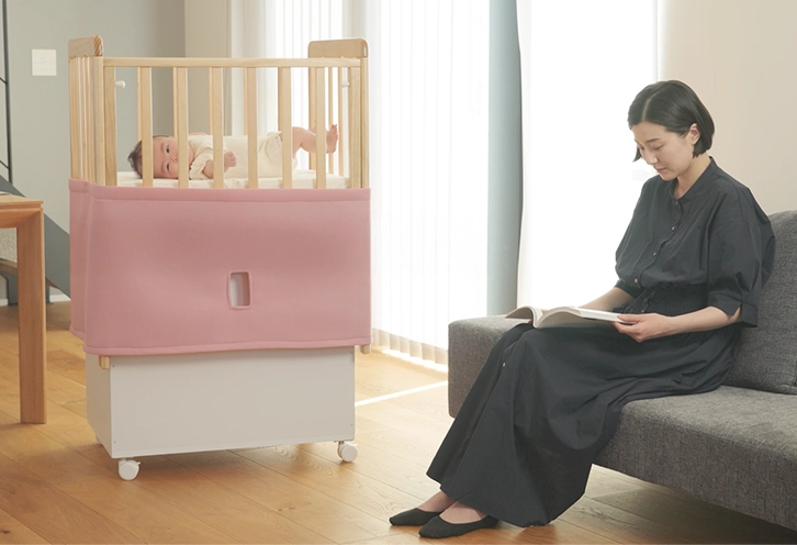「なかなか寝付かない」「抱っこで寝かせてもベッドに置くとすぐ起きてしまう」——そんな新生児の寝かしつけや夜泣きに悩むご家庭に向けて、揺動式ベビーベッドねら~れは開発されました。